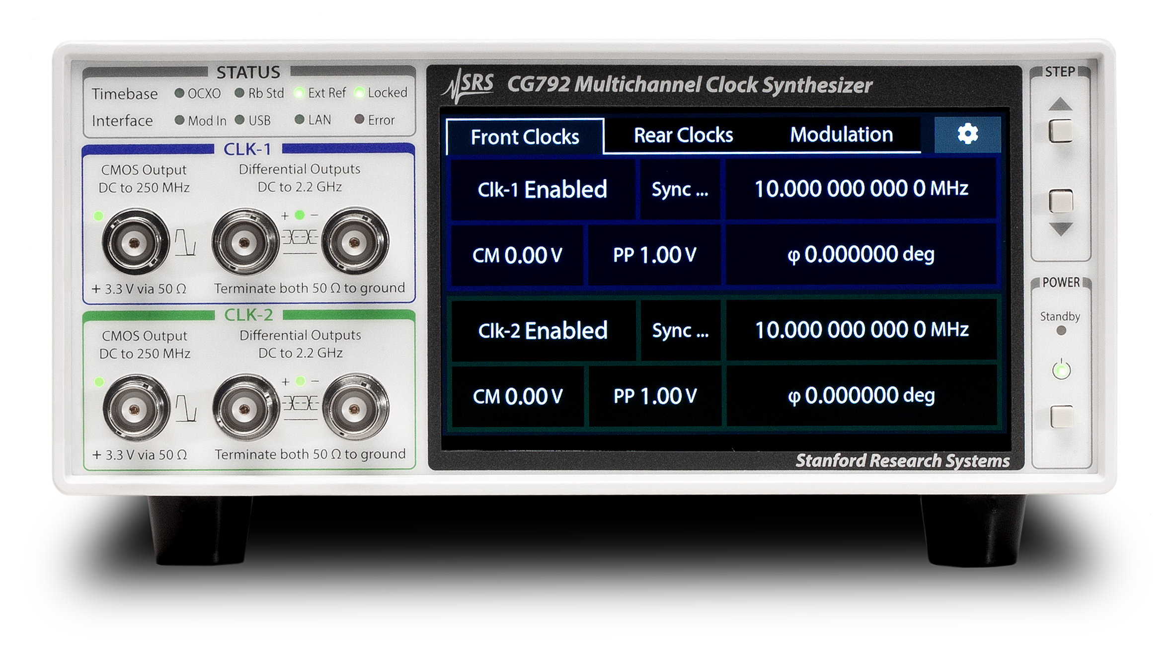 The CG792 features a 5-inch color TFT display with capacitive touch interface. The system organizes functions through intuitive tabs covering clocks, keypad entry, synchronization, modulation, and settings. Large numeric readouts combine with comprehensive parameter tables for immediate visual feedback.